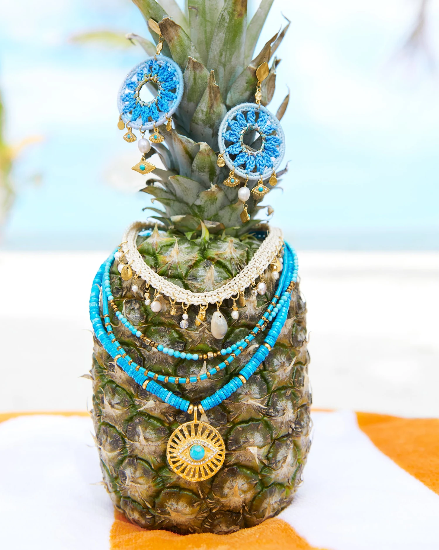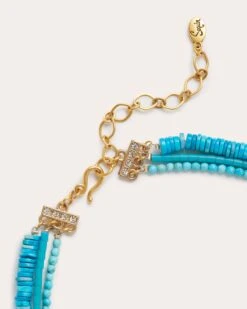 A mesmerizing addition to any neckline, the Amoura Necklace will deliver a bohemian touch to your everyday style. Complete with three rows of howlite dyed turquoise with metal castings, the glass bead adorned evil eye pendant adds a lucky touch.