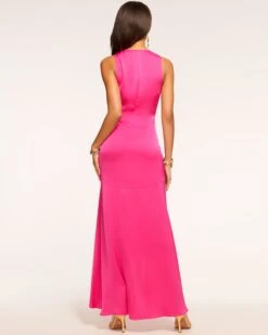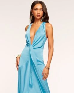 Hit a fashion high note with the Ashlyne, an impactful design made with celebration in mind. Crafted with silky satin charmeuse and a plunging neckline, this dress ties at the waist for a flattering touch, while the asymmetrical hemline completes the style.