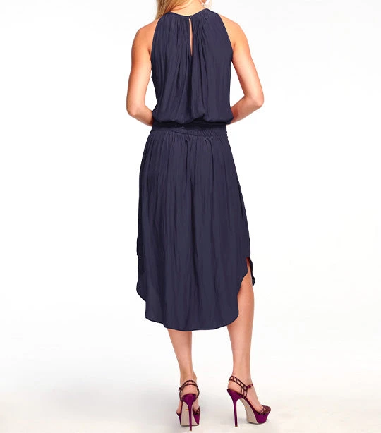Make an entrance at your next garden soiree in the alluring Ramy Brook Audrey Smocked Midi Dress Navy, an elevated midi dress made in our diaphanous crepe de chine. Cut high at the neck, the billowing silhouette meets at the shirred waist for a fitted touch ahead of descending to the midi length with side slits. In a beautiful shade of dune, slip into this stunning design and stop to smell the roses.