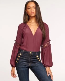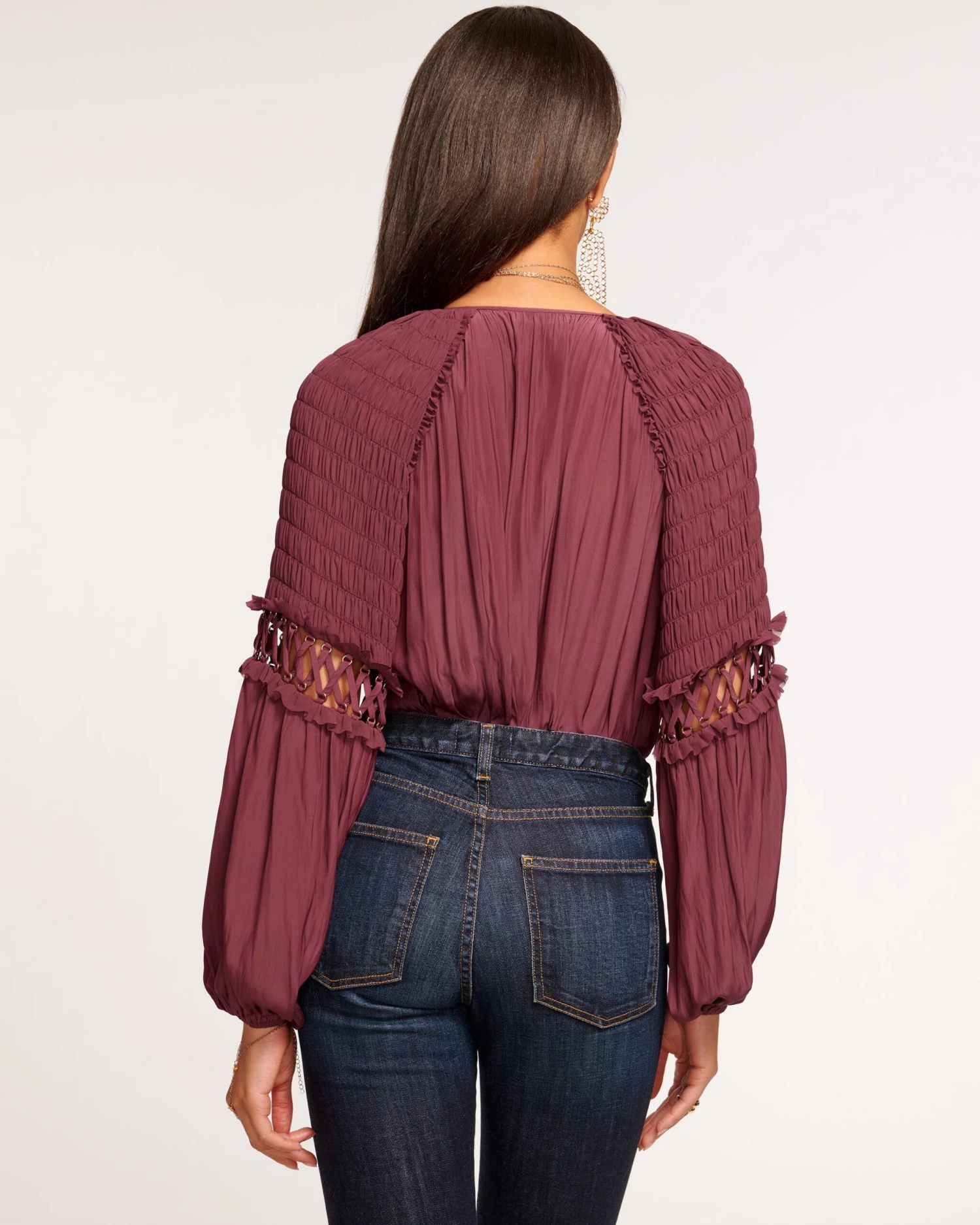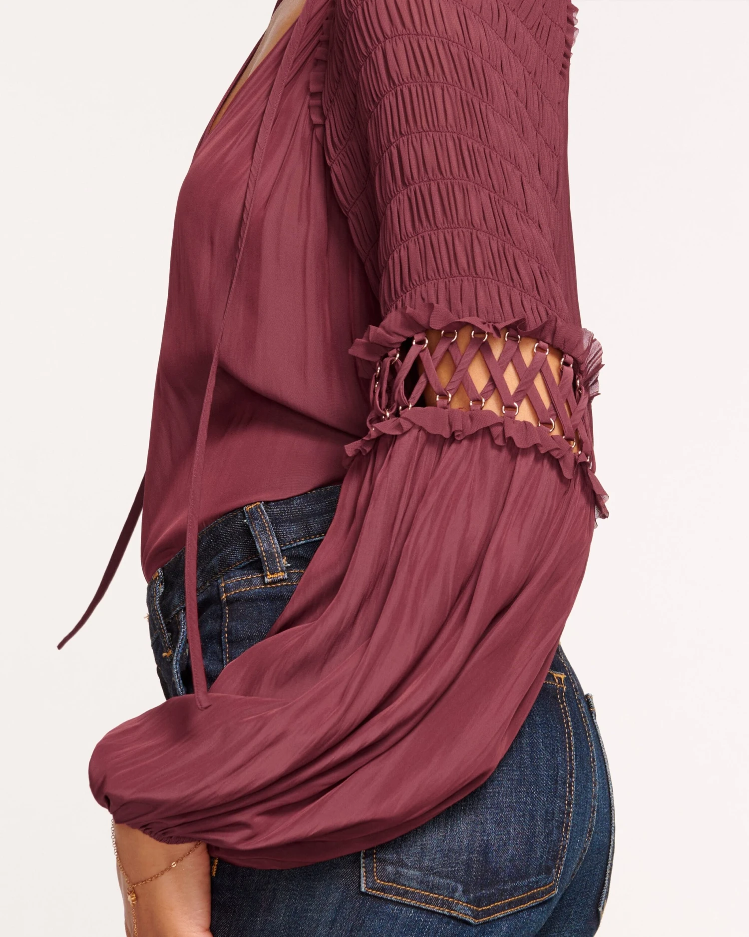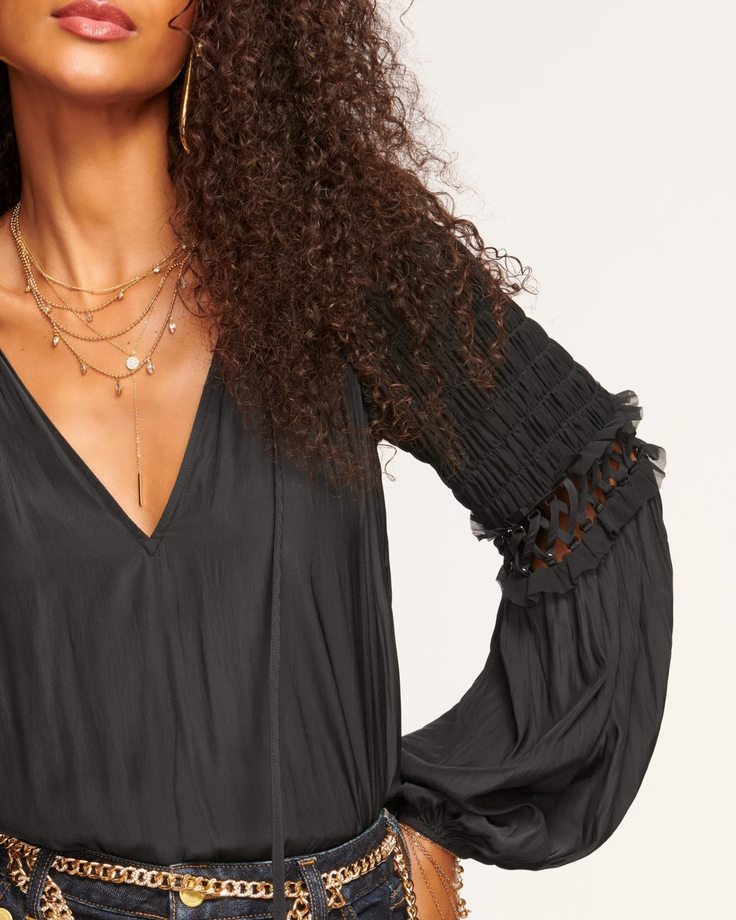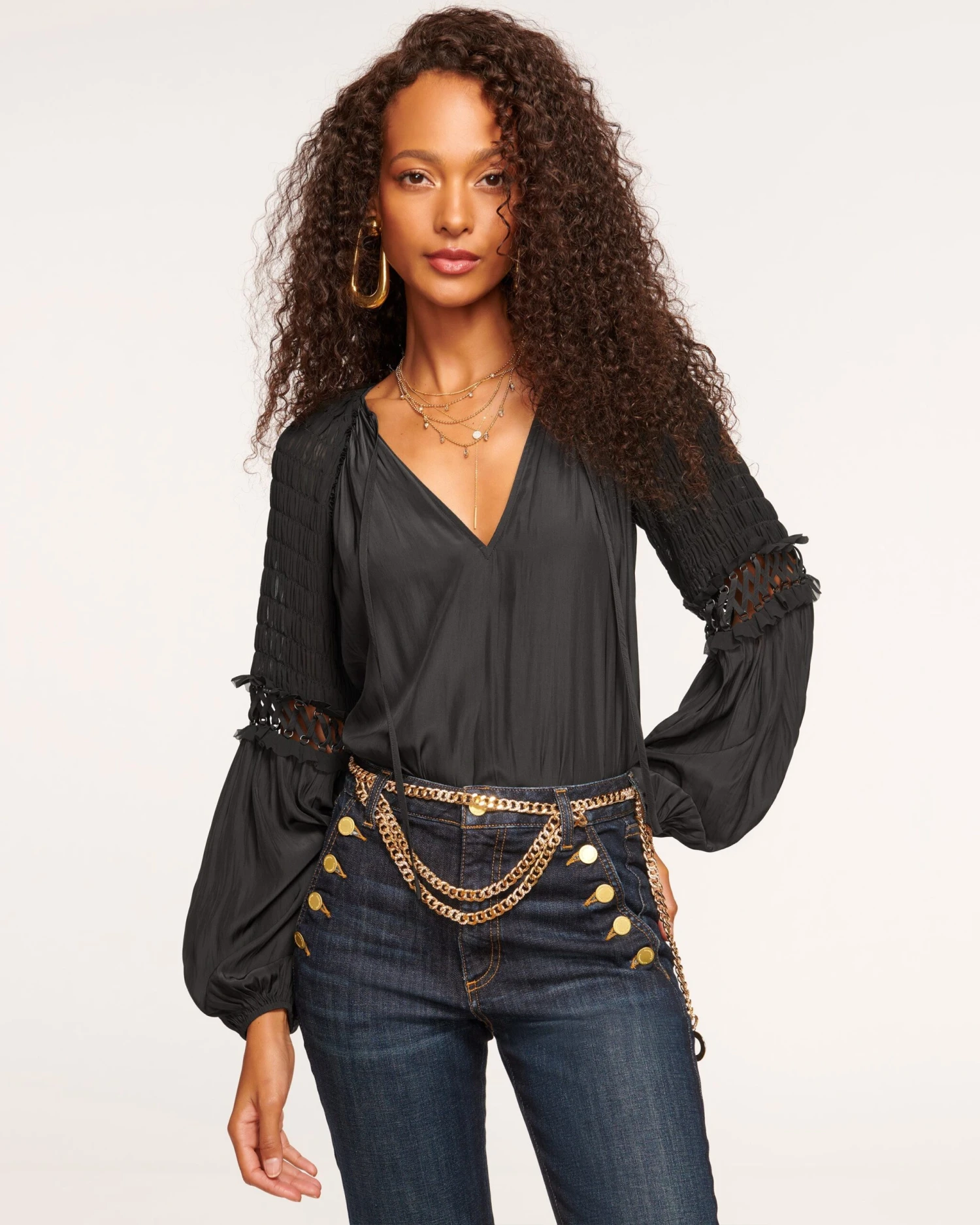 Perfectly polished and with a hint of edge, the Ayla makes the case for statement blouses. Fashioned with our classic crepe de chine for an always flattering fit, allow the sleeves to steal the show with the smocked detailing and sultry lattice cut outs.