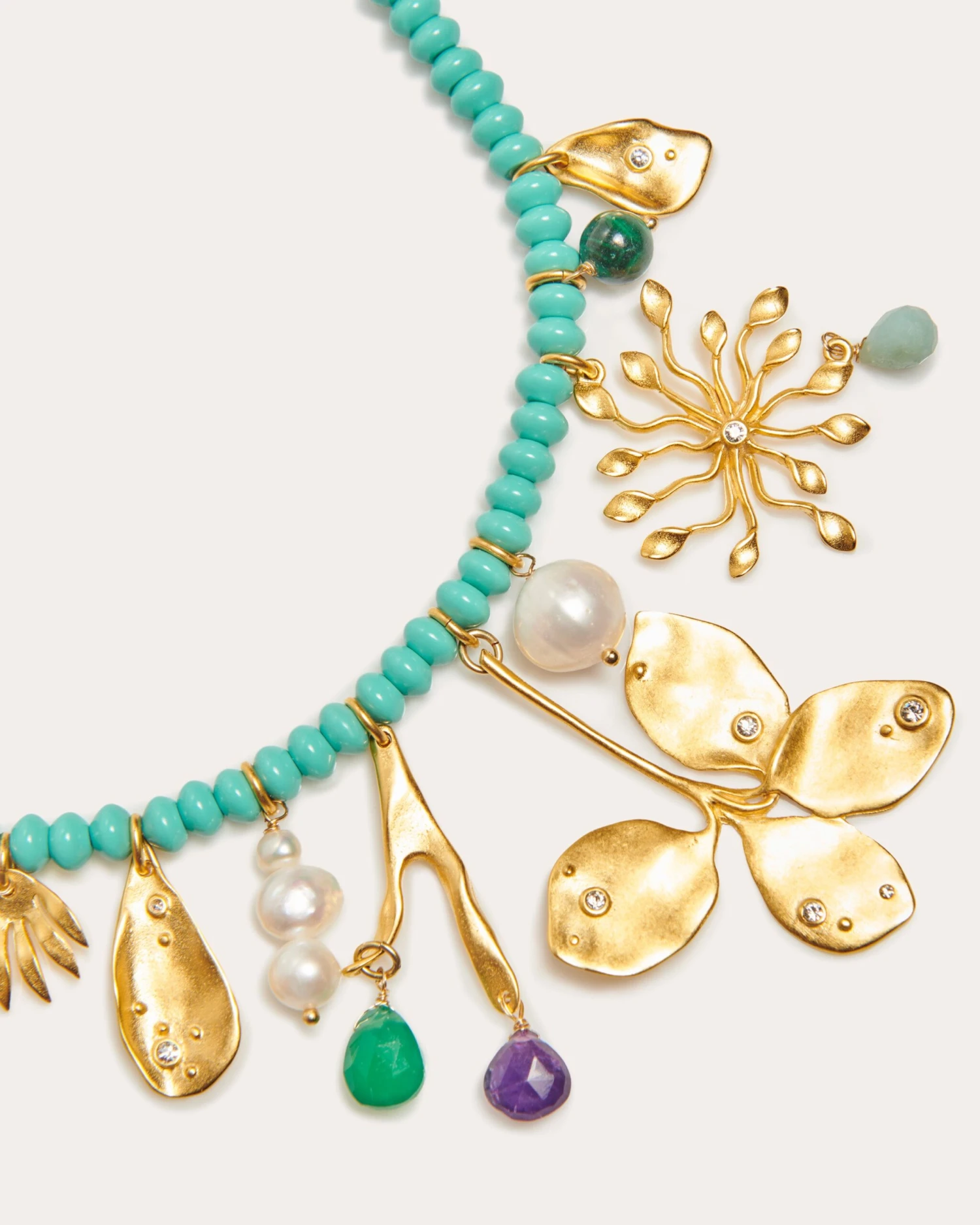 Level up your neckline with the Capri Necklace, a howlite dyed turquoise piece adorned with abstract metal castings for a radiant delivery. Complete with semi-precious stones, including malachite and amethyst, make any look memorable with this special design.