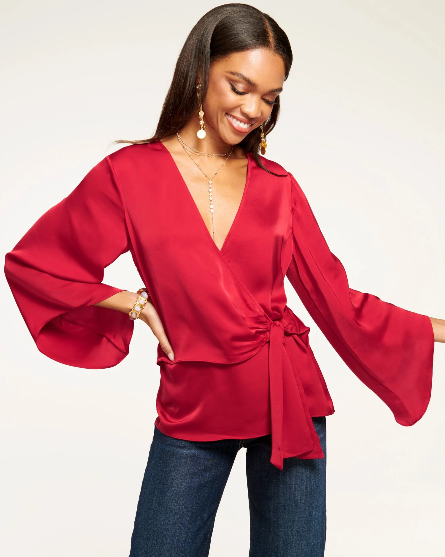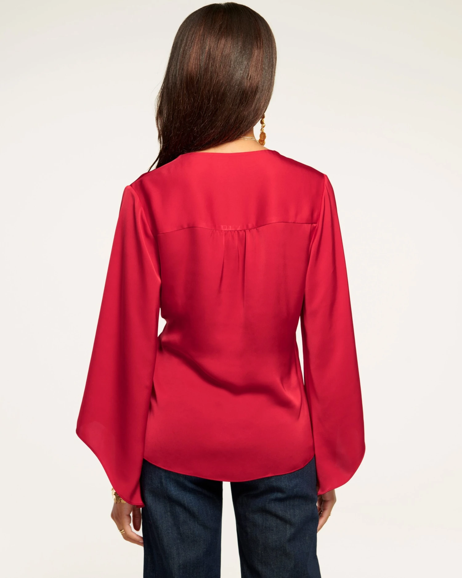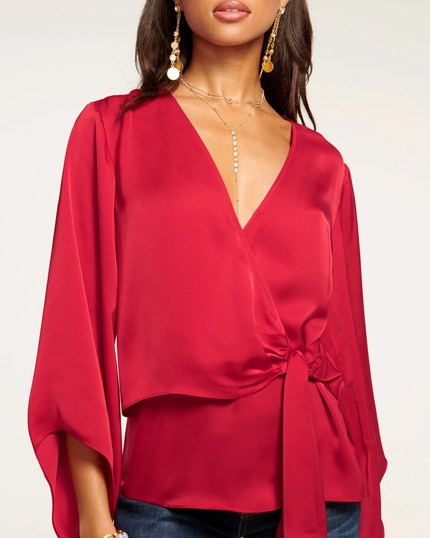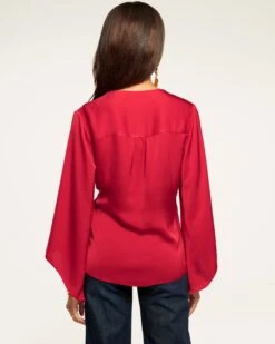 Graceful and elegant, every wear of Cassandra will have you feeling like your best self. The v-neck, wrapped bodice with side tie promises a figure flattering fit, while the loose sleeves with statement cuffs add a playful touch. Crafted in silky satin in a striking shade of scarlet, swap out your trousers for denim to seamlessly take this elevated staple with you from office to cocktails in no time.