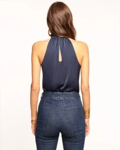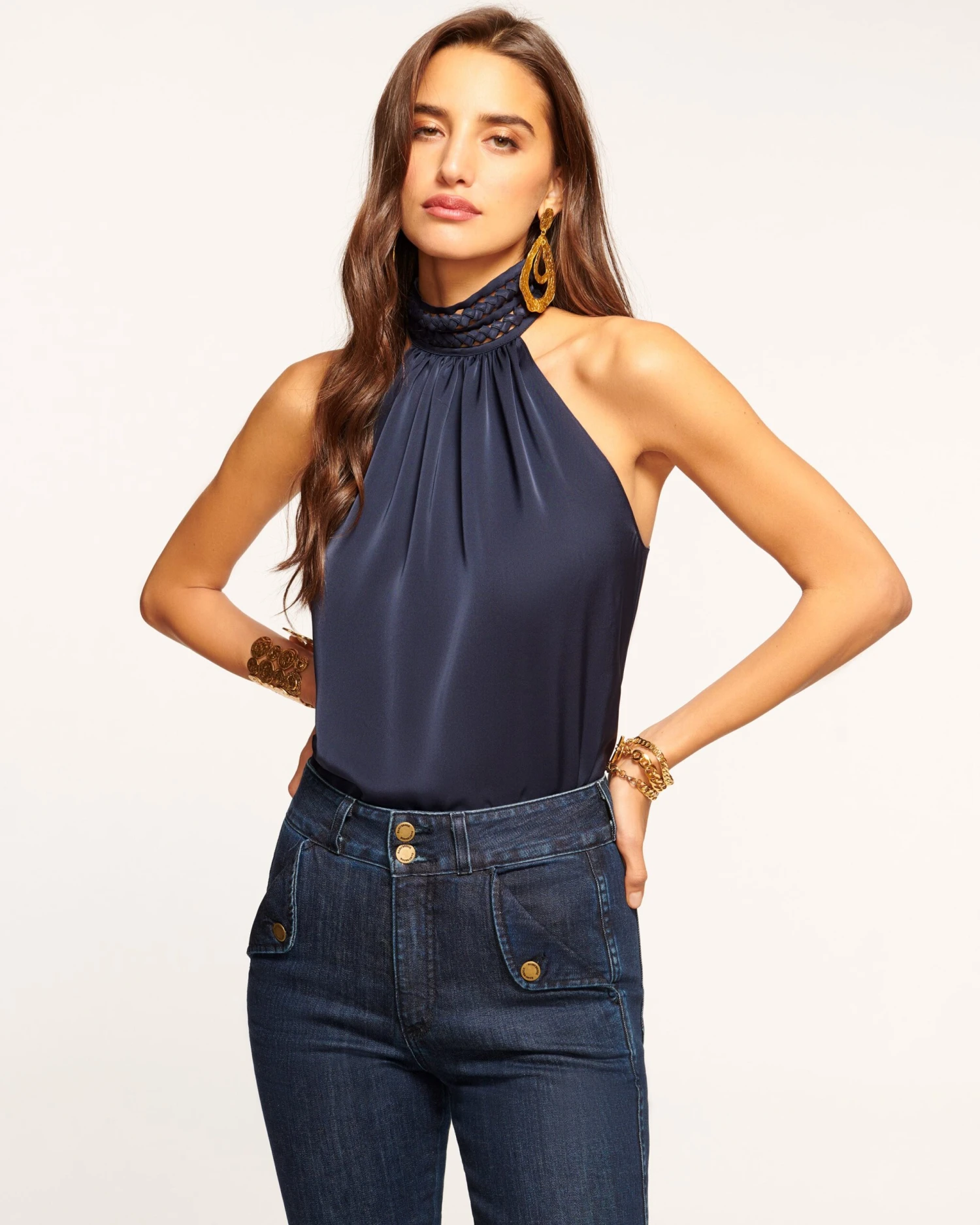 A top that never tires, let the Everleigh do the heavy lifting for your next night out. This sleeveless satin charmeuse top has an alluring braided neckline for a sultry spin, while the keyhole cut out on the back ties this statement style together.