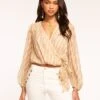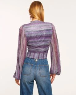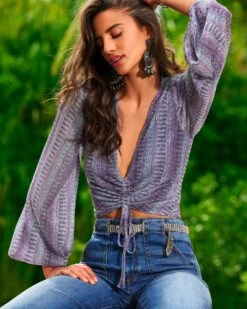 Shine bright beneath Friday night lights in the Georgia, a dynamic crop top complete with statement sleeves and a plunging neckline. The 70s-inspired knit fabrication will add a touch of sparkle to a pair of jeans or denim shorts.