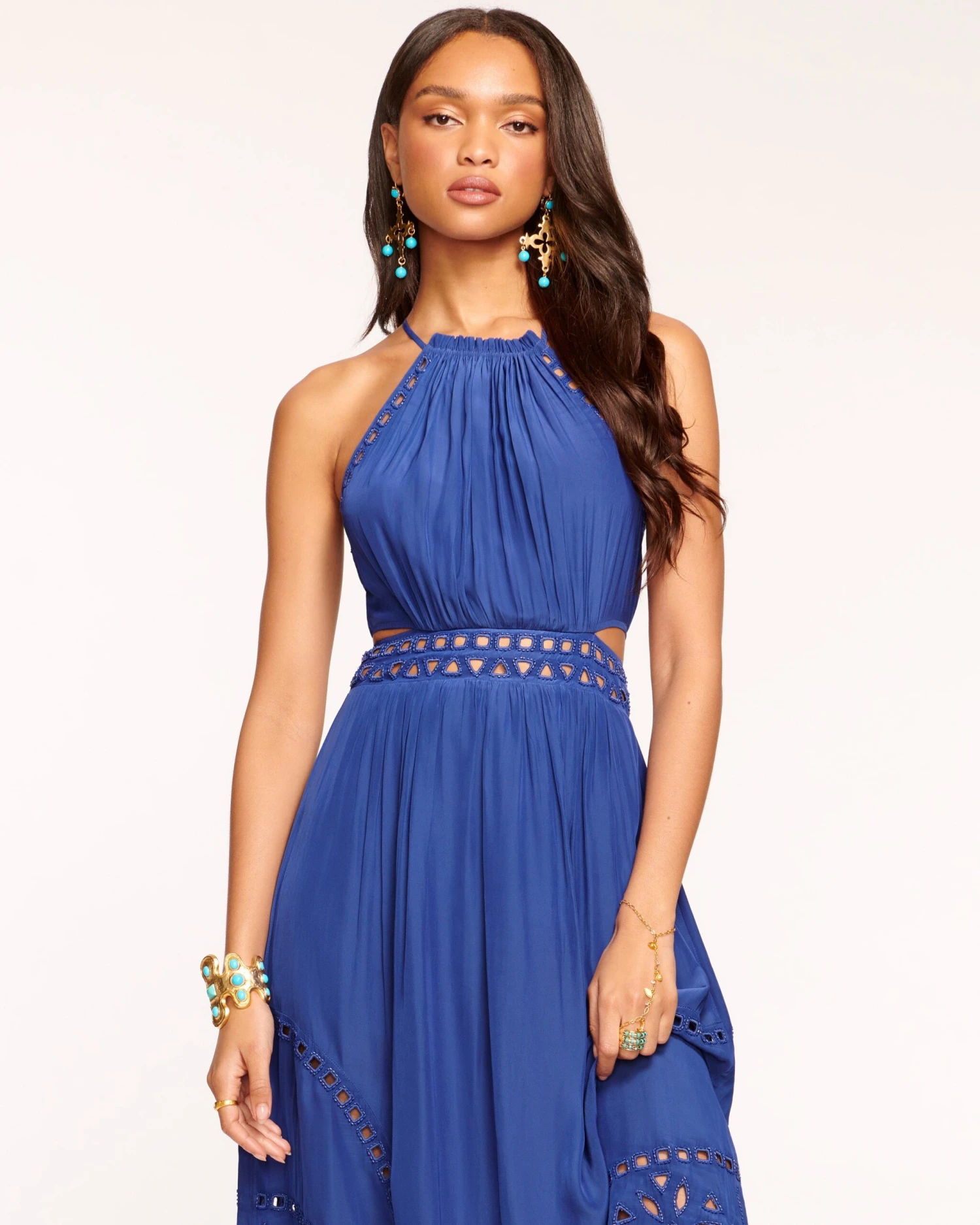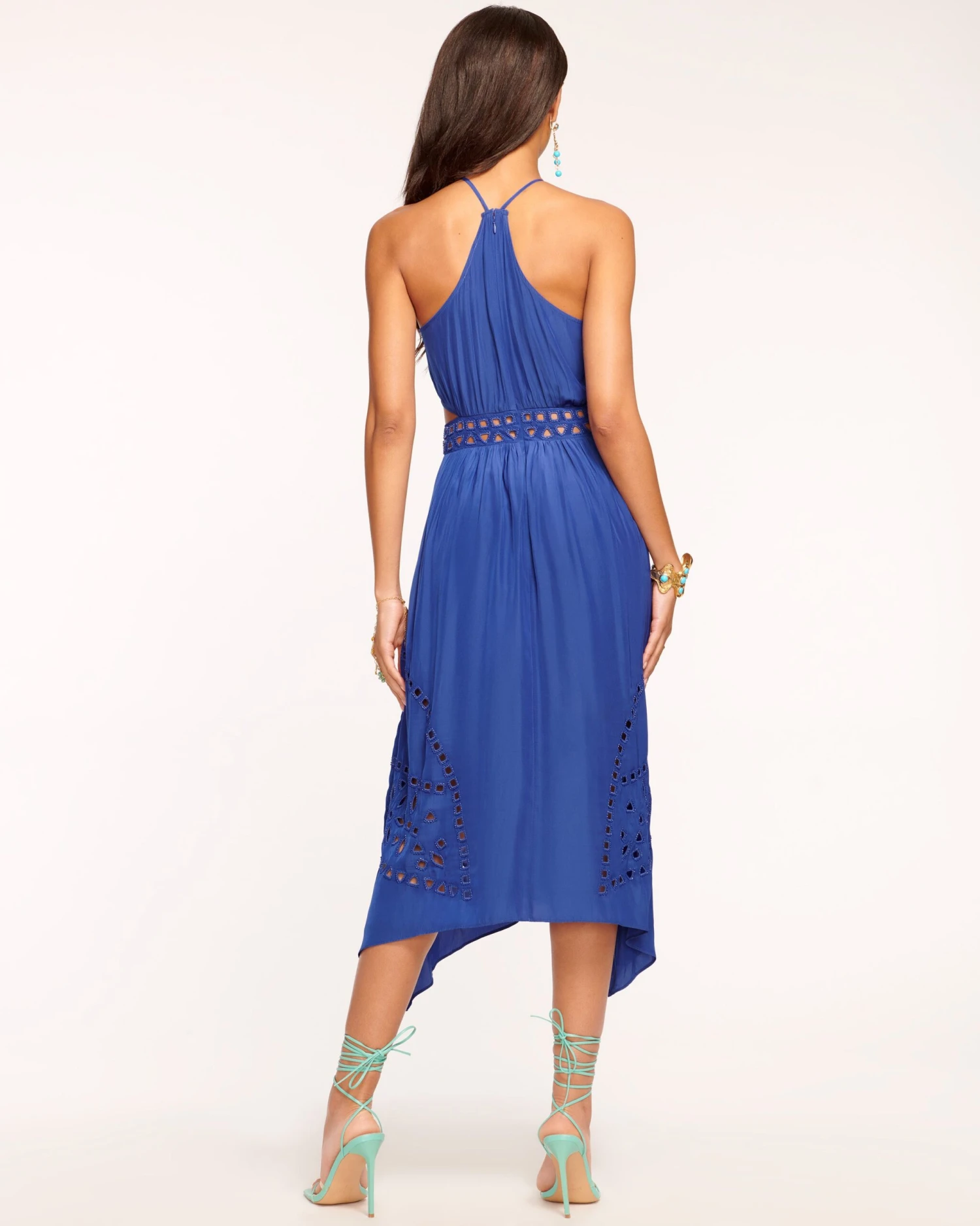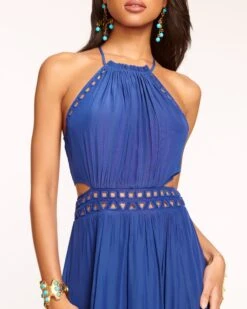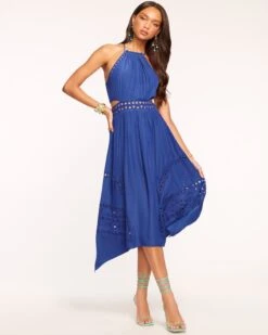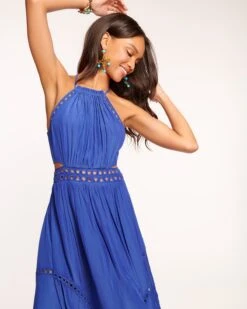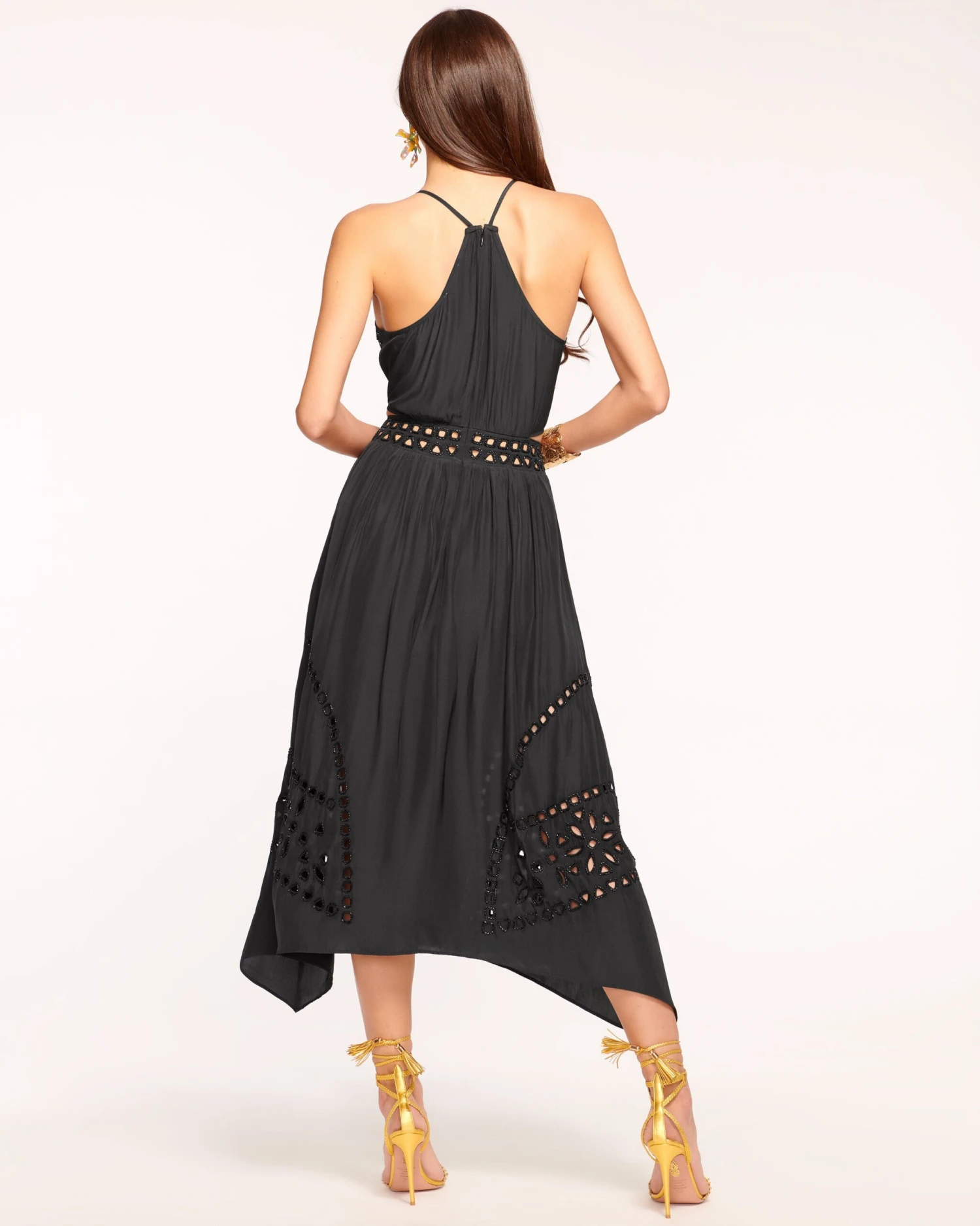 You’ll be the main character in any room when you arrive in the Henley, a crepe de chine midi that’s both sophisticated and stylish. Crafted with a thin strapped halter, the sultry beaded cutouts add a head turning touch to this party approved dress.