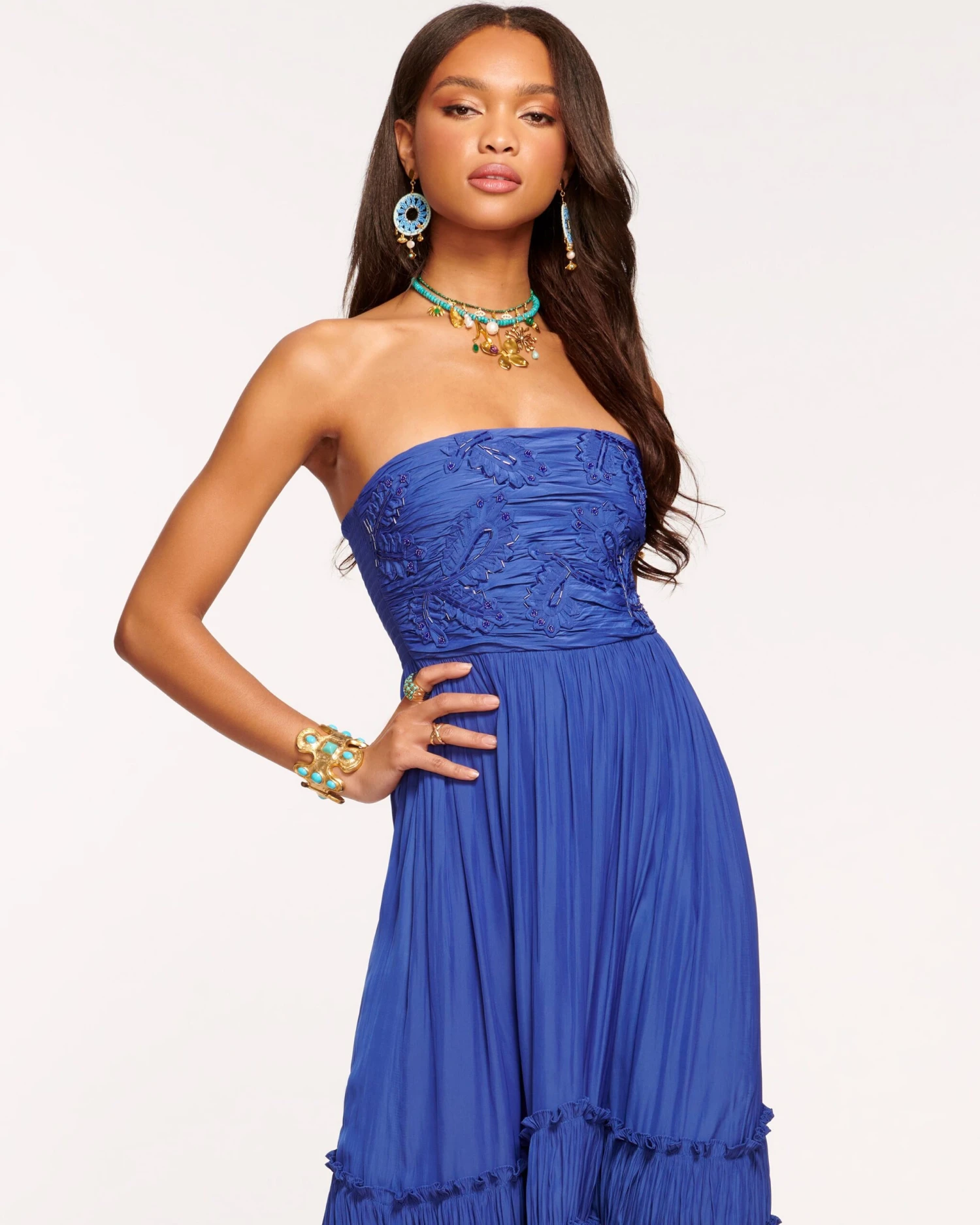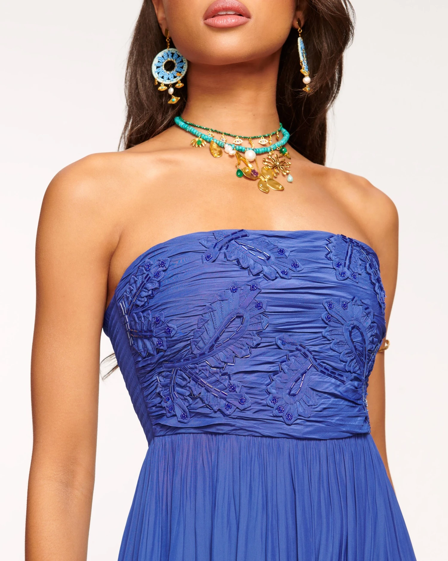 Champion vacation dressing when you slip into the Ingrid, a special design suitable for a beautiful destination. The intricate details on the bodice add a statement touch to this fluid dress, crafted with crepe de chine for optimal movement with every step.