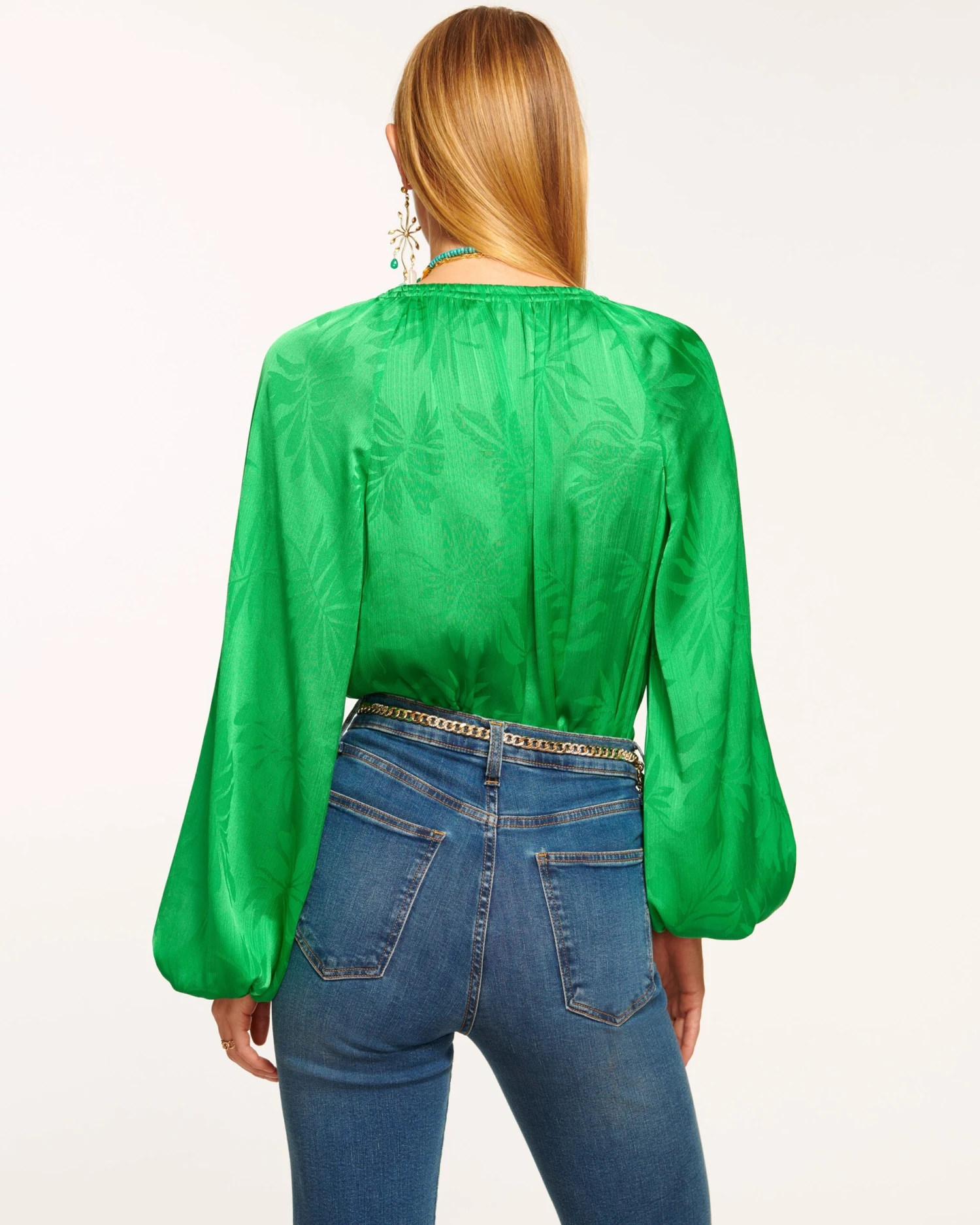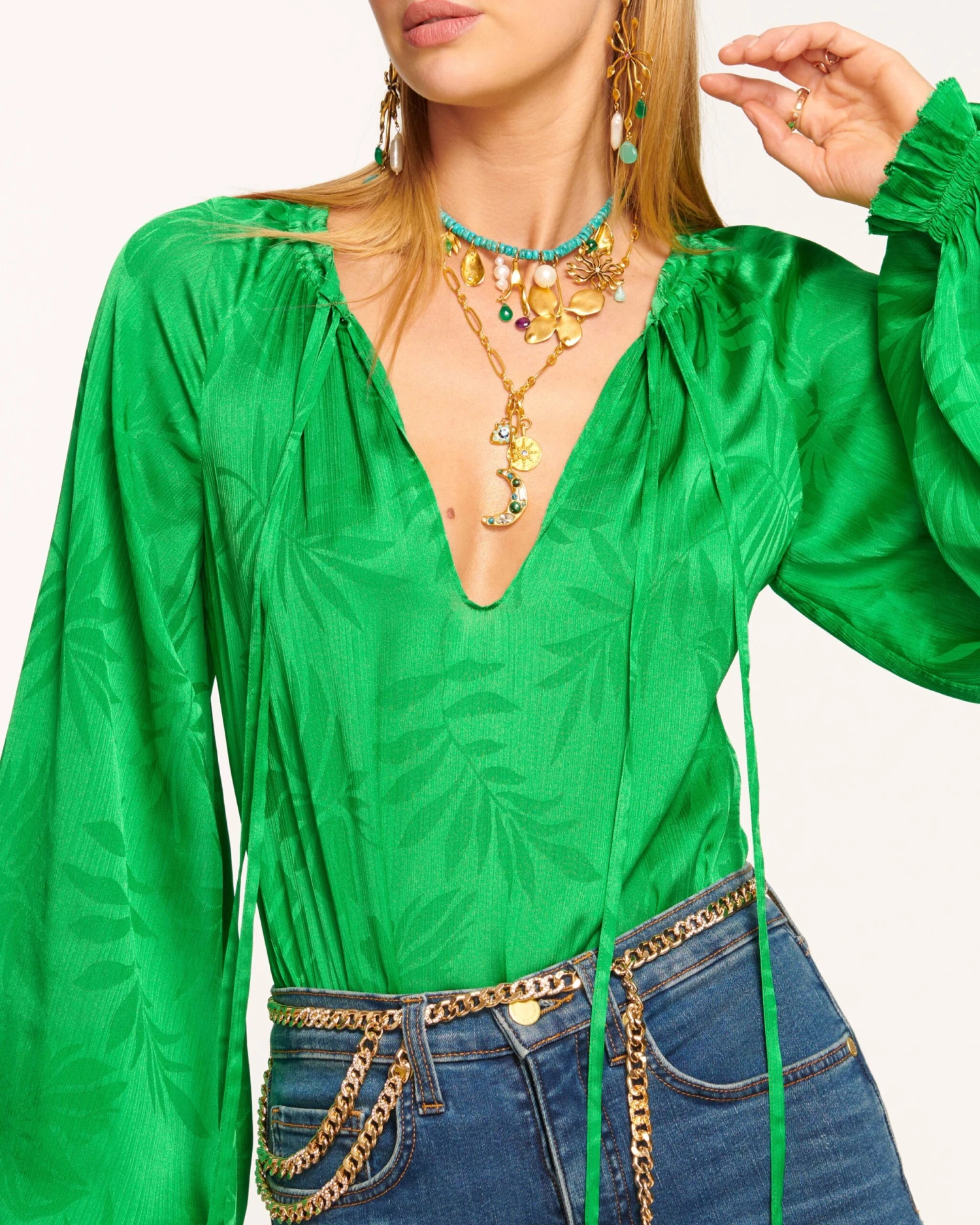 Take island style to the concrete jungle with the Joni, a stylish blouse that knows no fashion bounds. Fashioned with dramatic sleeves for a statement touch, this island palm jacquard piece can be worn opened or closed thanks to the self-tie neckline.