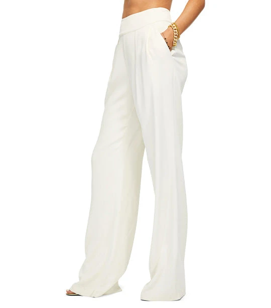 Meet our do it all trousers, the stylish Ramy Brook Joss Wide Leg Pant Ivory. Fashioned in rich satin, this breezy design has a striking tuxedo-inspired waist detail for a dose of dimension. Simply swap your white t-shirt for a cropped top and blazer to take these transformational trousers from day to night.