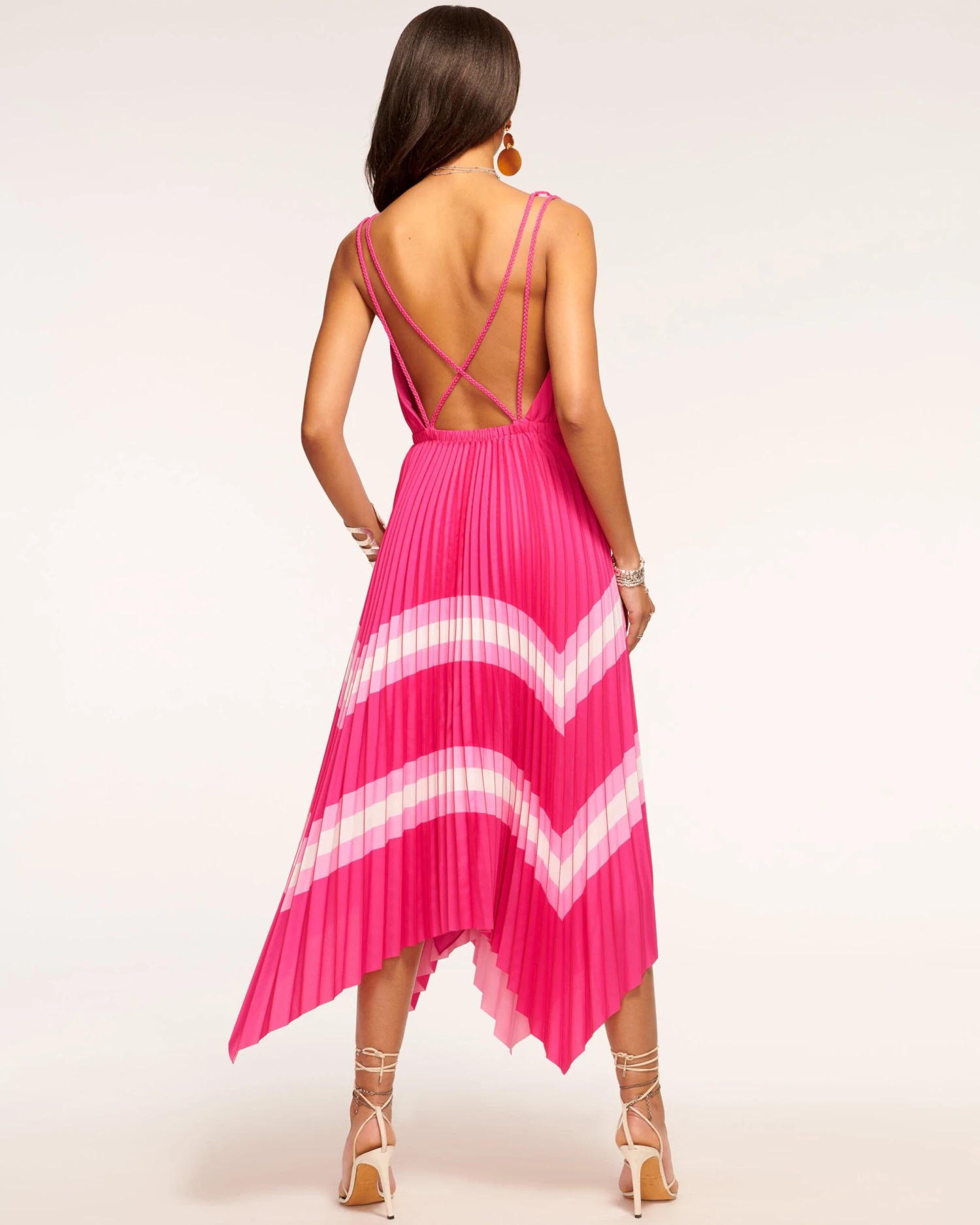 Breeze through your next special occasion in the Klaudia, a stylish dress you’ll dazzle in. The beautiful pleated fabrication adds a dynamic touch to this mid-length skirt. A plunging neckline and asymmetrical helpline featuring a bold stripe that ties this look together.