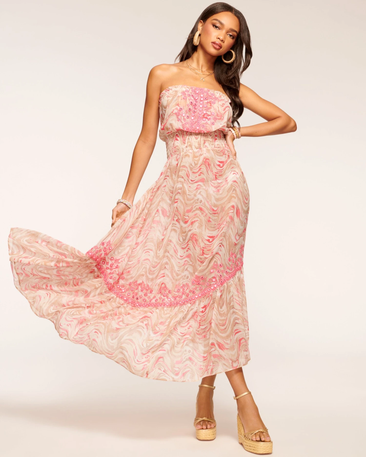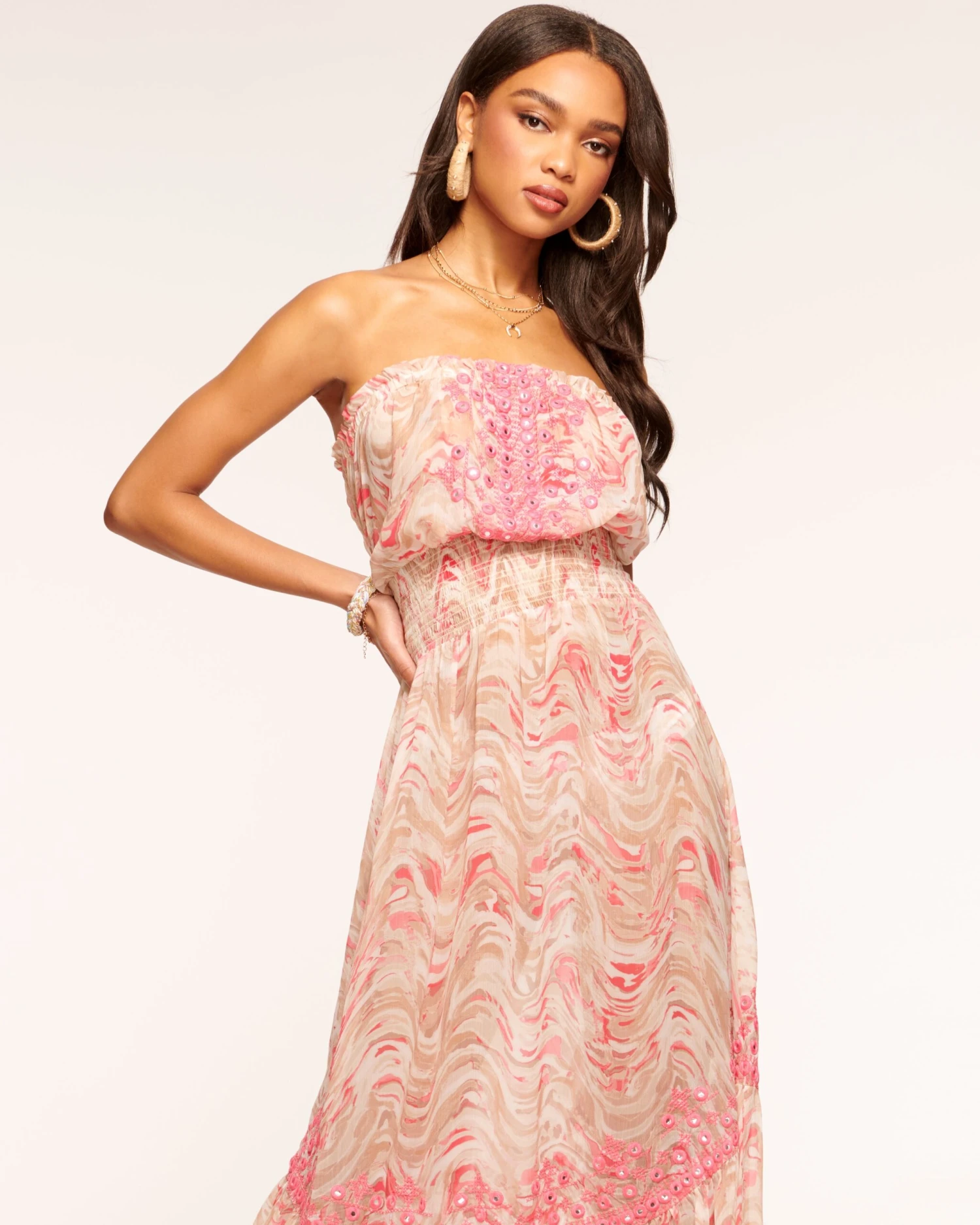 Summer in style with the Lilly, a lightweight dress worthy of a tropical destination. The sleeveless bodice with embroidery details lends way to the shirred waist, while the flowing silhouette on this mid length style is both stylish and practical.