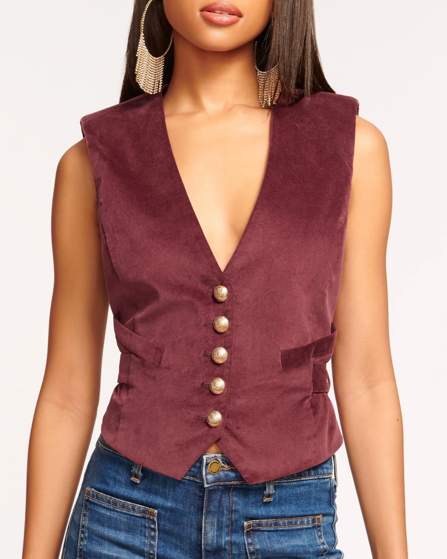 Champion your fall wardrobe with the Margot, a velveteen top that’s here to level up your fashion game. This statement sleeveless style has a deep v-neckline and a button down silhouette, providing a gilded touch with the high shine metallic details.