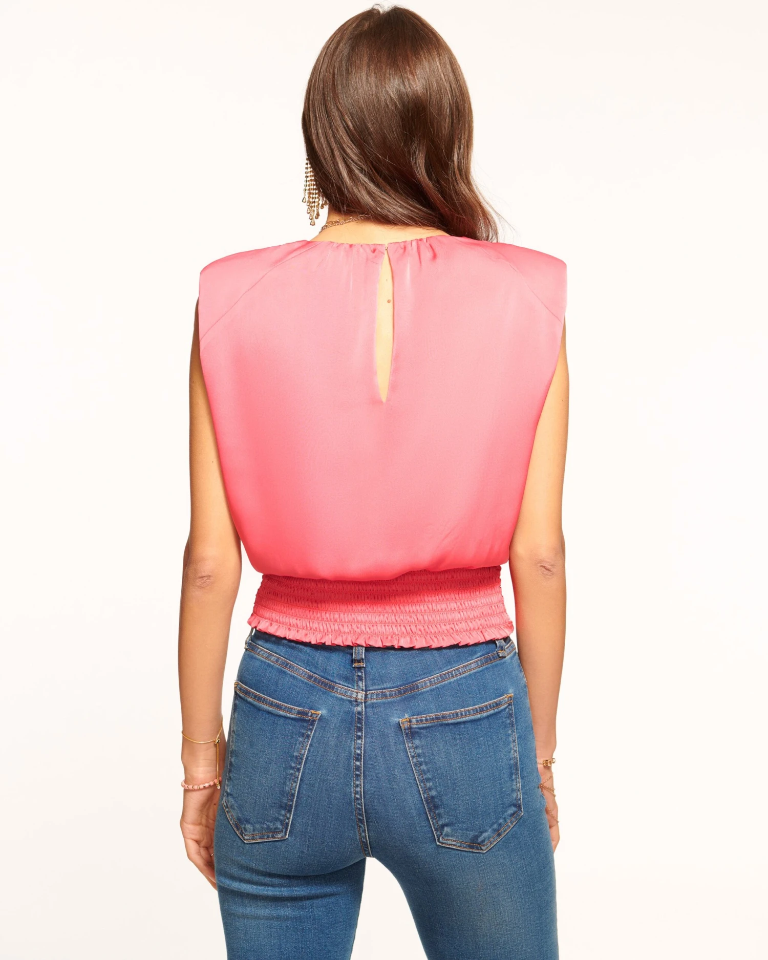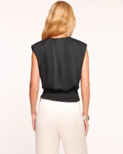 Redefine your style with the Peyton, a contemporary blouse that’s embellished to perfection. This sleeveless piece touts braided details that trail down the v-neck silhouette, while the statement shoulders and fitted waist complete with look with ease.