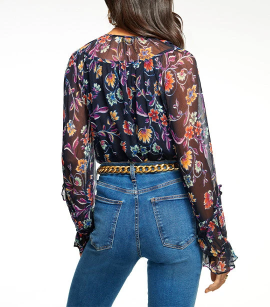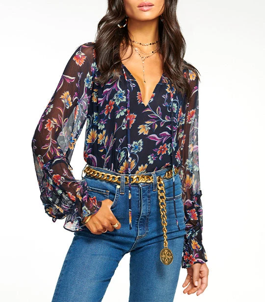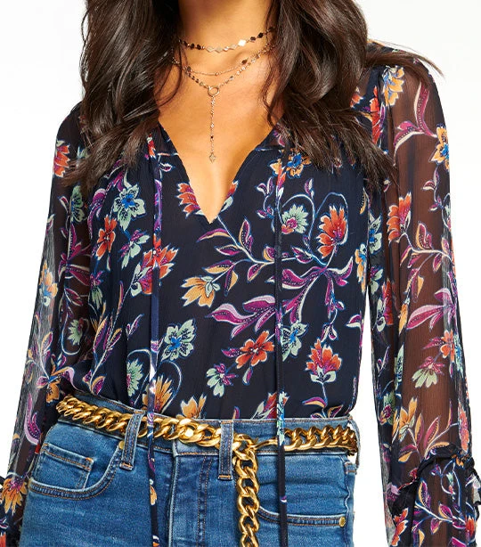 No closet is complete without the floral Ramy Brook Printed Rosalind Blouse Navy Jardin, a classic button-down blouse crafted in black silky satin. This diaphanous design has feminine shoulder bow details, a sweet compliment against the short silhouette. Made to expertly pair with denim and skirts alike, the Jacinta is the epitome of a wardrobe staple.