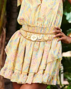 Transform any outfit by layering on the Rain Charm Belt. Designed in New York and sure to be your new go-to, this tiered gold chain belt has multi-sized coin drops and charms that make this statement design the perfect accessory for a mini dress or silky set.